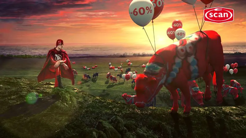 HKScan, the largest meat producer in the Nordic region, published a television advertisement in Sweden, in which there is a superhero character standing with cows painted with the traditional Swedish “Dala horse” pattern.